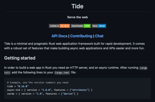 はじめに Tide とは プロジェクトの作成 Hello World パスパラメータを受け取る JSON を返す クエリパラメータを受け取る POSTパラメータを受け取る はじめに Rust の Web アプリケーションフレームワークとしては actix-web rocket がメジャーで、 tide war…