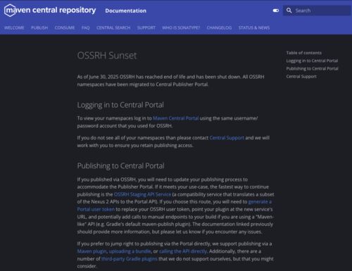 はじめに Central Portal へのログイン ネームスペースの登録 鍵生成と公開鍵の登録 トークン作成 プラグインの設定 公開 はじめに OSSRH(Sonatype OpenSourceSoftware Repository Hosting)は2025年6月30日でサービス終了となり、Central Publisher Portal …